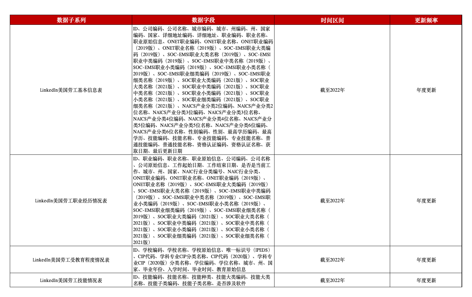 本平台数据团队推出LinkedIn美国劳工简历数据,主要包含在线互联网公开平台、互联网公开资料等多个来源,本数据采用了自然语言处理的方式进行了职位、行业等内容的标准化处理,含有劳工基本情况表、职业经理情况表、受教育程度情况表、技能情况表四个模块,包含公司、地址、职业、学历、技能、发布日期等字段。