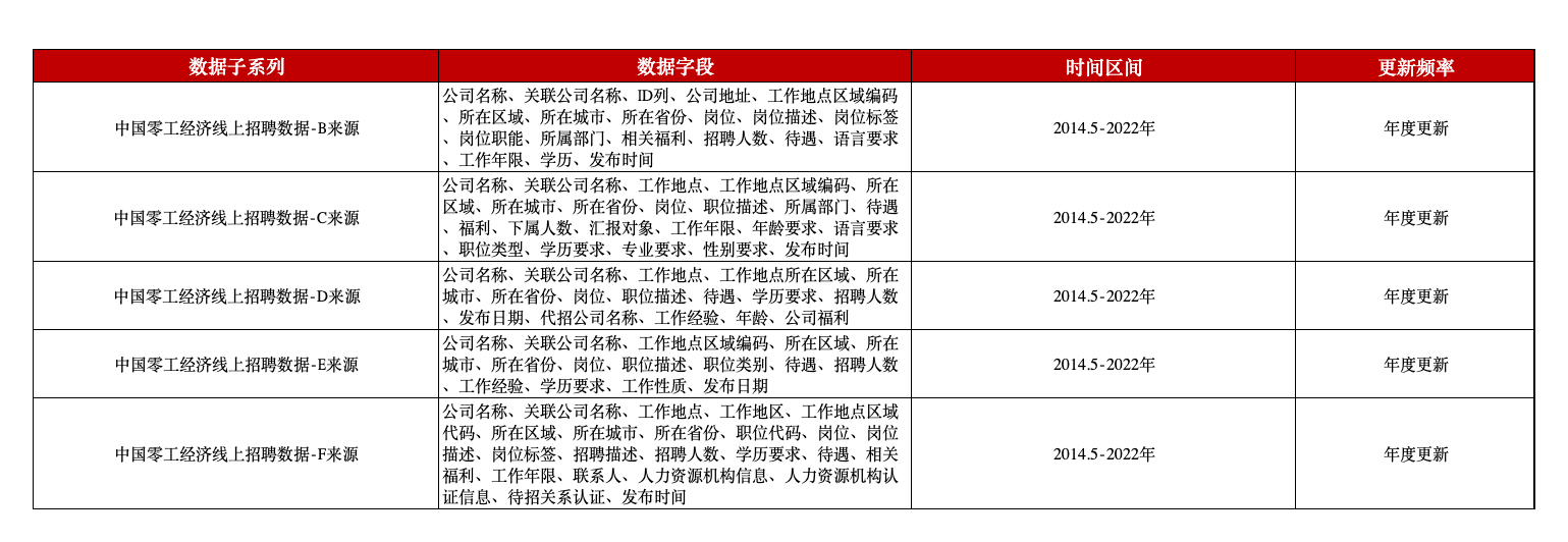 中国零工经济线上招聘数据以外卖、美团、饿了么、闪送、骑手、滴滴、代驾、兼职、副业、灵活用工、平台经济等关键词为建库检索依据,包含5个招聘数据来源的零工经济线上招聘信息,涵盖公司名称、工作地址、岗位、招聘人数、待遇、工作年限、学历、发布日期等字段,为相关研究提供数据支持。