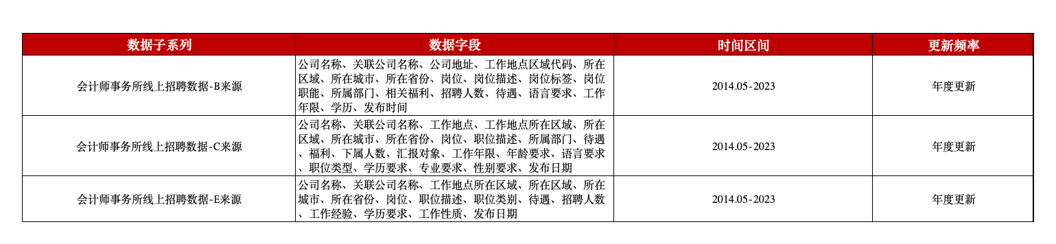 会计师行业作为我国专业性较强的行业,在人力资源的供需方面也有着与其他行业截然不同的要点。为助力相关研究,本平台在线上招聘网站信息数据-B\C\E来源中提取会计师事务所为主体的招聘信息,得到了会计师事务所线上招聘数据,涵盖公司名称、所在区域、岗位、招聘人数、待遇、语言要求、工作年限、学历、发布时间等字段内容。