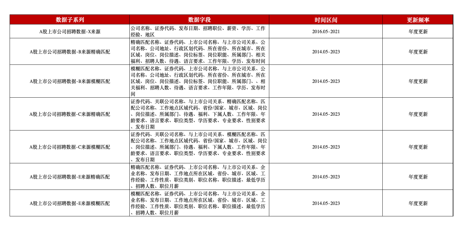 本平台A股上市公司招聘数据整理了上市公司发布的不同岗位统计数据,区分了X、B、C、E不同来源,包含公司名称、证券代码、招聘职位、发布日期、薪资、学历、工作经验、地区等信息,为上市公司相关研究提供了优质的数据资源。