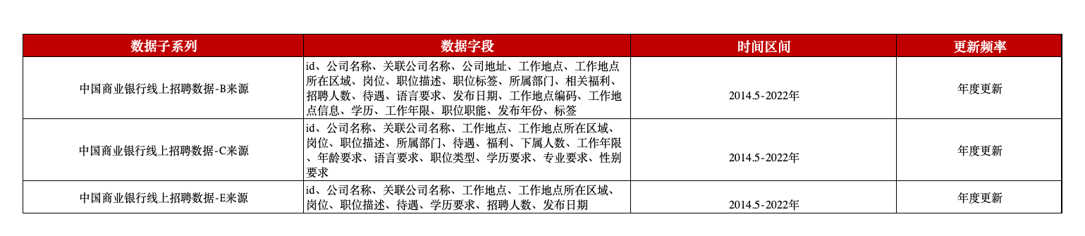 作为中国金融行业的重要组成部分,银行业在人力资源的供需方面也有着与其他行业截然不同的要点。为助力相关研究,本平台在线上招聘网站信息数据-B来源及E来源中提取银行为主体的招聘信息,得到了中国境内银行及其支行的线上招聘数据,涵盖公司名称、所在区域、岗位、招聘人数、待遇、语言要求、工作年限、学历、发布时间等字段内容。
