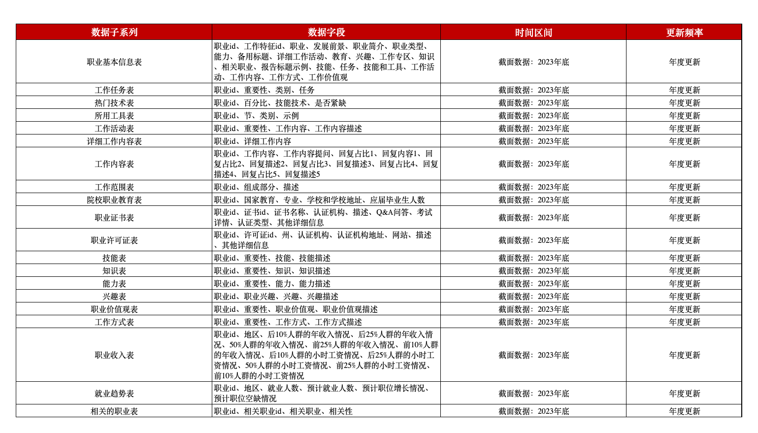 CnOpendata推出O*NET美国职业岗位特征数据,覆盖 1000 多个职业,以 2018 年版的国际标准职业分类体系为基础,覆盖与职业相关的技能、能力、知识、工作活动和兴趣信息等内容,这些信息可用于促进职业探索、职业咨询和各种人力资源等研究。