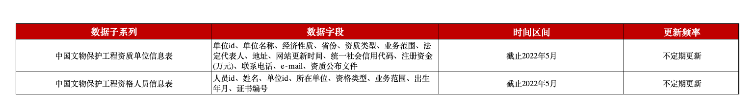 本平台中国文物保护工程数据分为文物保护工程资质单位信息表、文物保护工程资格人员信息表2张表,包含工程资质单位名称、经济性质、省份、资质类型、业务范围、法定代表人、地址、资质公布文件、工程资格人员姓名、所在单位、资格类型、业务范围、证书编号等字段。