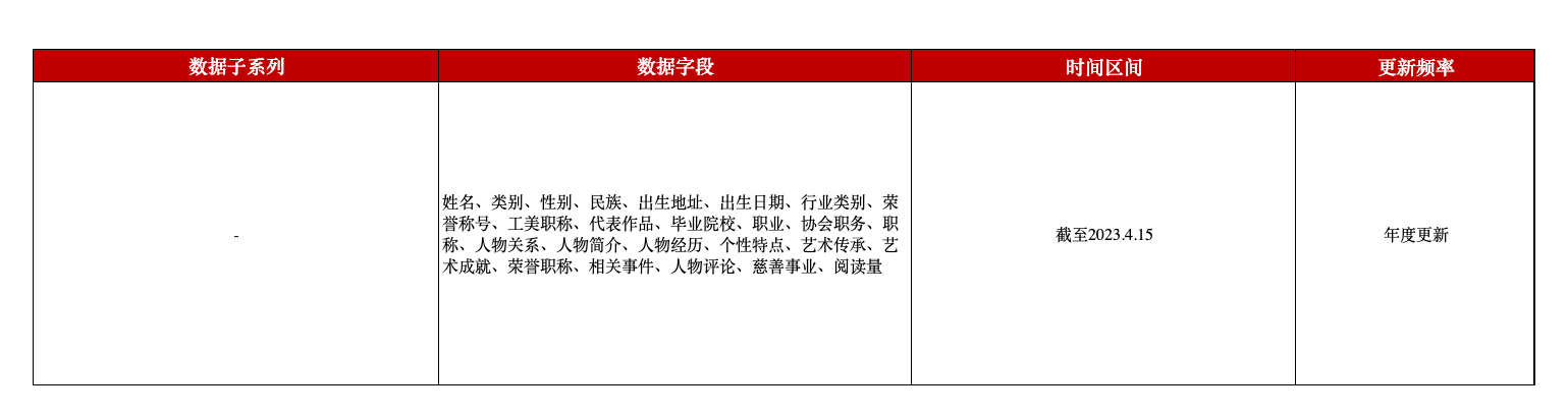 本平台推出全国工艺美术大师信息数据,包含雕塑、陶瓷、金属、漆器、花画、编制、刺绣、挂毯、首饰、民族、其他等11种类别的国家级、亚太级、省级工艺美术大师和部分从业爱好者的人物经历,数据中涵盖了丰富的人物简介文本内容,是极有价值的人物文本数据。