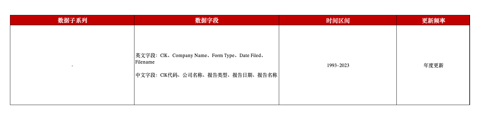 本平台整理了近30年内共计两千三百万份美国上市公司披露的全部报告,包含报告原始文本及索引表格,为相关研究助力。
