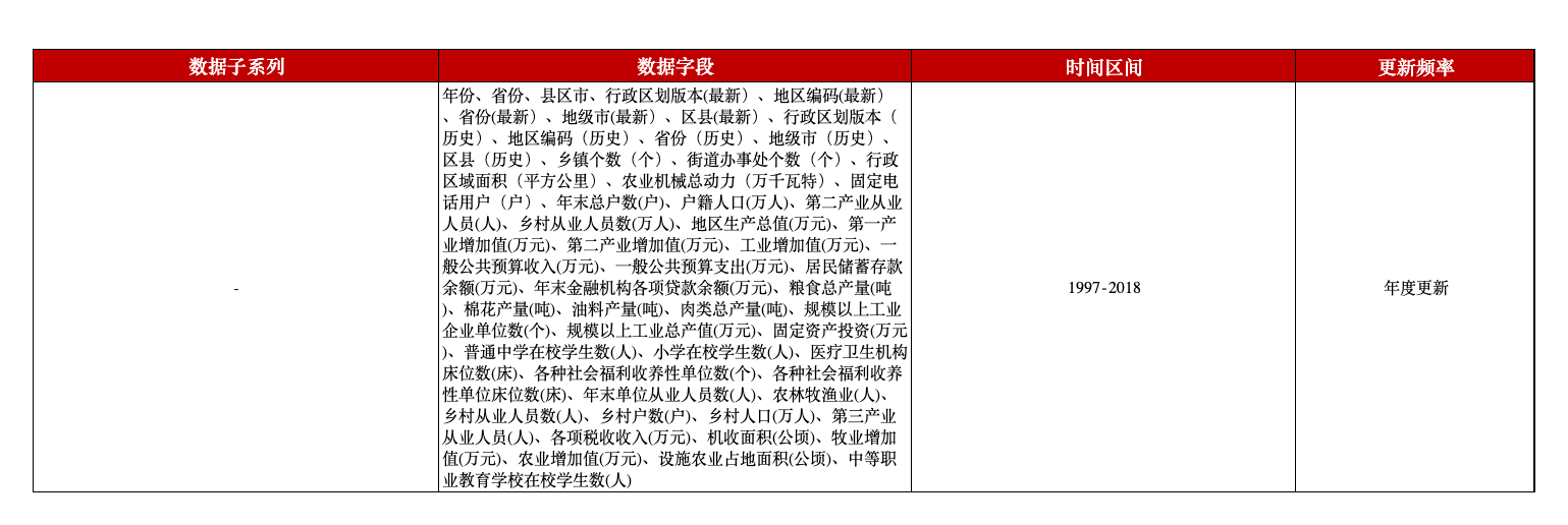 本平台整理了《中国县域统计年鉴(县市卷)》,形成中国县域统计年鉴数据,涵盖年份、省份、县区市、所属行政区划、街道办事处个数、户籍人口、产值、一般公共预算、乡村从业人员数等指标,以支持相关研究。