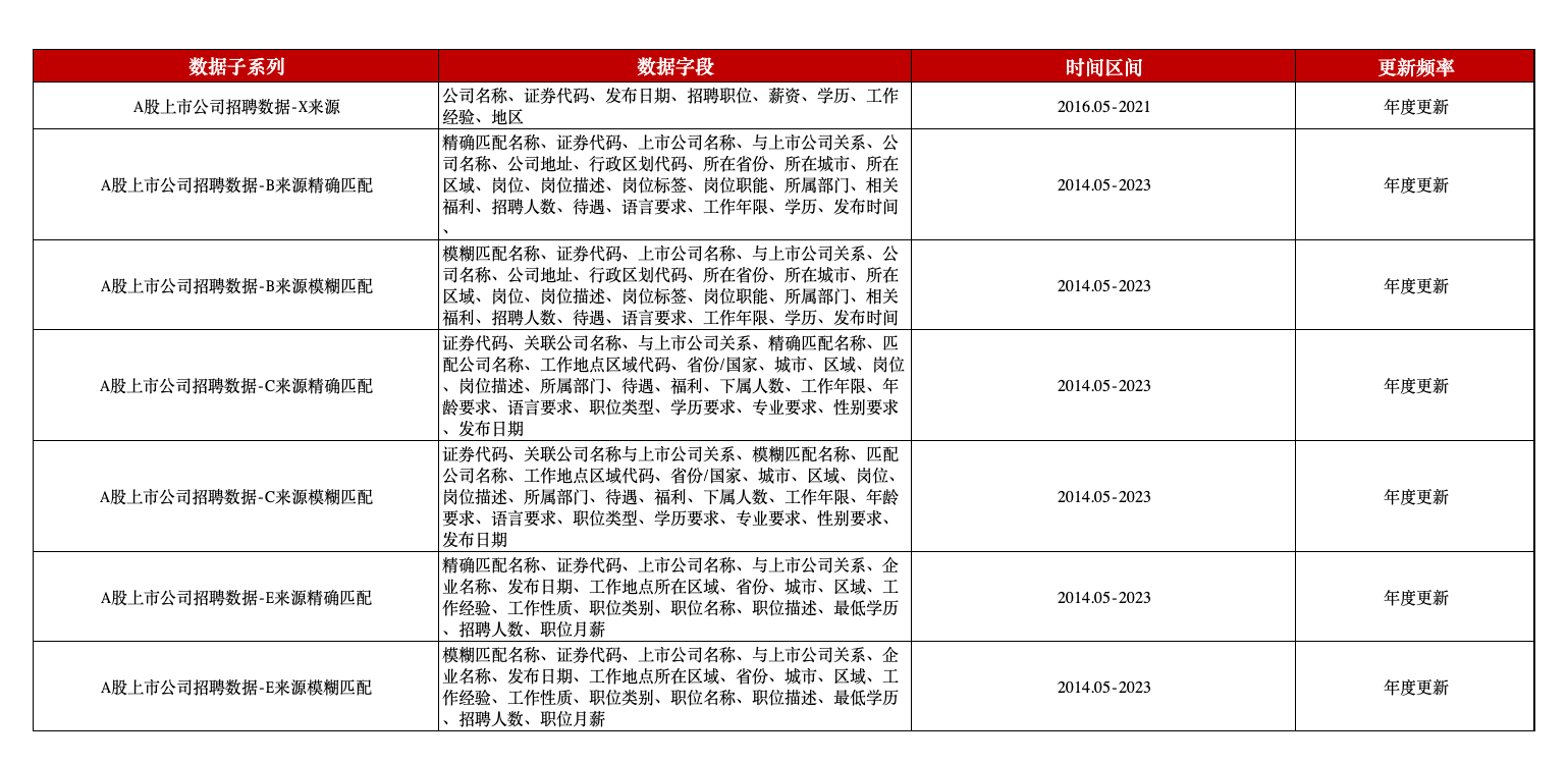 本平台A股上市公司招聘数据整理了上市公司发布的不同岗位统计数据,区分了X、B、C、E不同来源,包含公司名称、证券代码、招聘职位、发布日期、薪资、学历、工作经验、地区等信息,为上市公司相关研究提供了优质的数据资源。