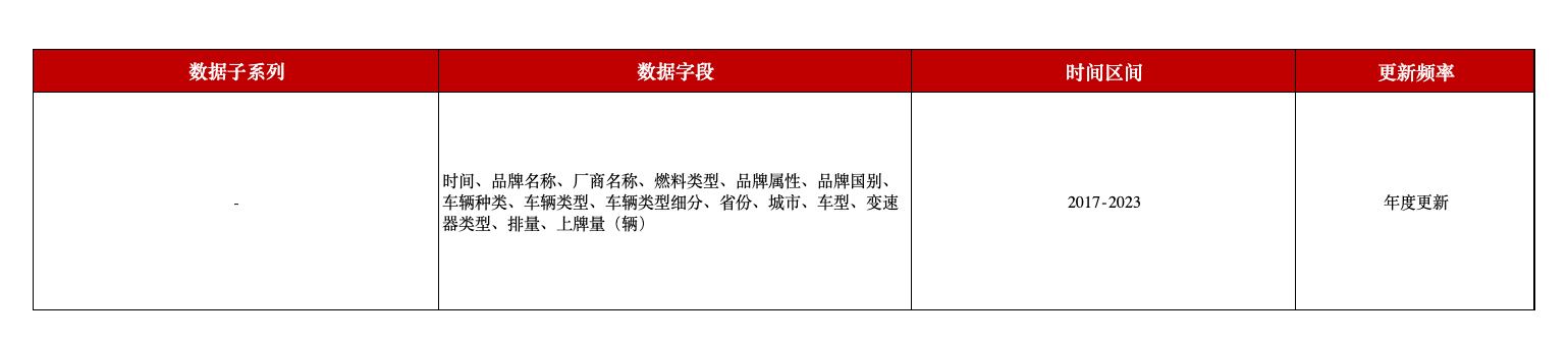 除各省市的汽车上牌情况外,数据库还对应整理提供了上牌车辆的品牌、型号等车系简述相关的内容。因此,除了能够了解到各地区新车上牌情况,还能有助于增强进行品牌市场分析、消费者购车偏好等方面的了解。