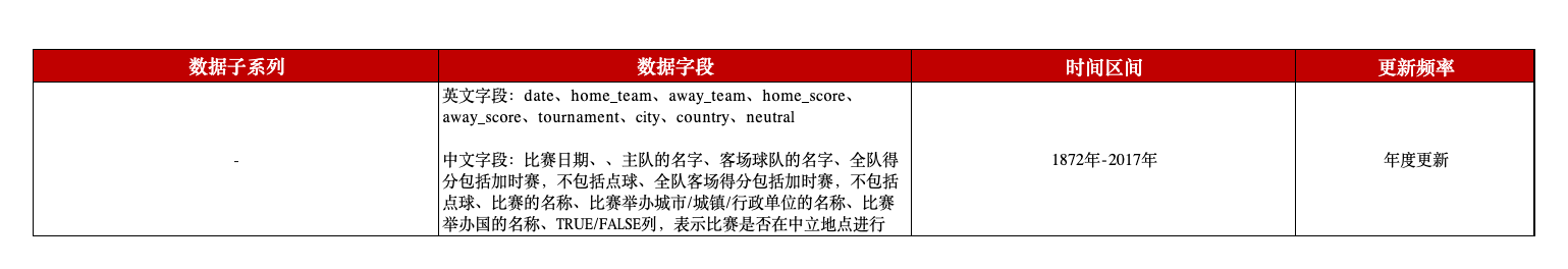巨大的观众体量和丰富的赛事背景下诞生了非常多的足球明星,也因历年的赛事而产生了有趣味性的数据集。本平台数据团队发布1872年至2017年间的足球赛事结果数据,涵盖比赛时间、主客球队名、得分情况、举办地等数据。