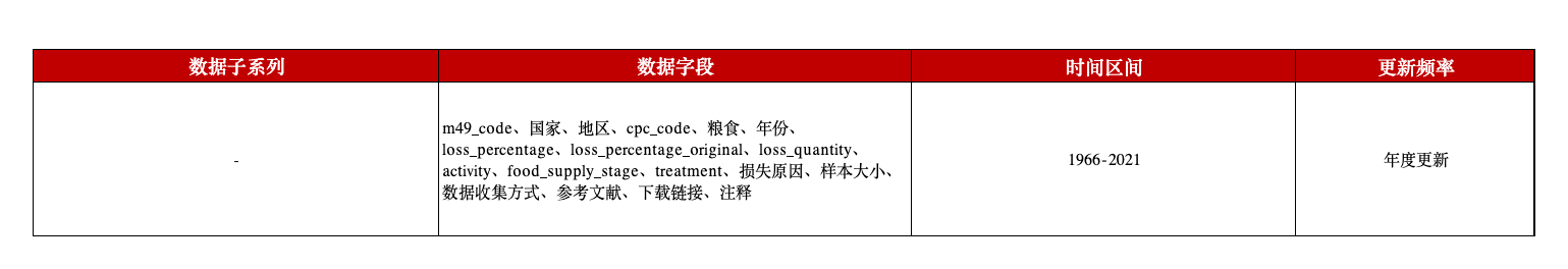 本平台全球粮食损失和浪费数据收集整理了科学文献综述和粮农组织统计数据库中粮食损失和浪费成因数据,涵盖了1966年起全球120多个国家的粮食浪费情况,包含国家、地区、粮食、损失量/占比、损失原因、样本大小、参考文献等,助力学者研究及衡量食品、价值链各阶段和地理区域的粮食损失和浪费。