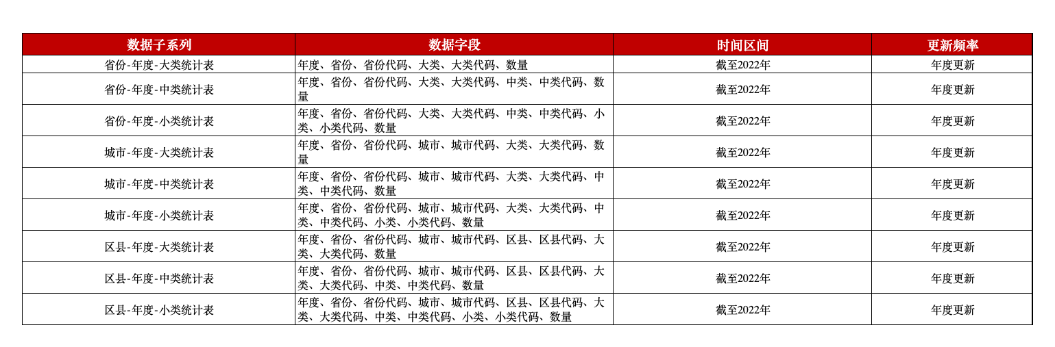 本平台对全国兴趣点数据进行了分地区分年份分类型的详细统计,涵盖年度、省份、城市、区县、大类、中类、小类、数量等字段,为相关研究助力。