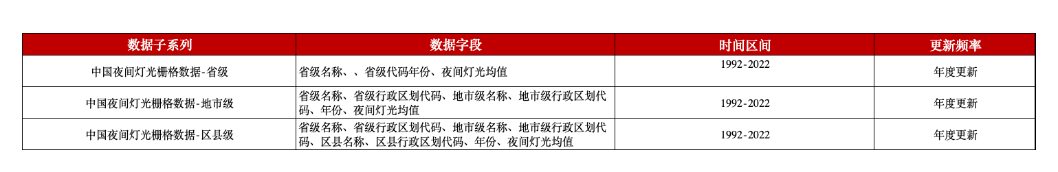 本平台推出中国省市县夜间灯光栅格数据,根据省、地级市、区县的行政区划层级,分为三张表格,主要提供夜间灯光的均值数据。