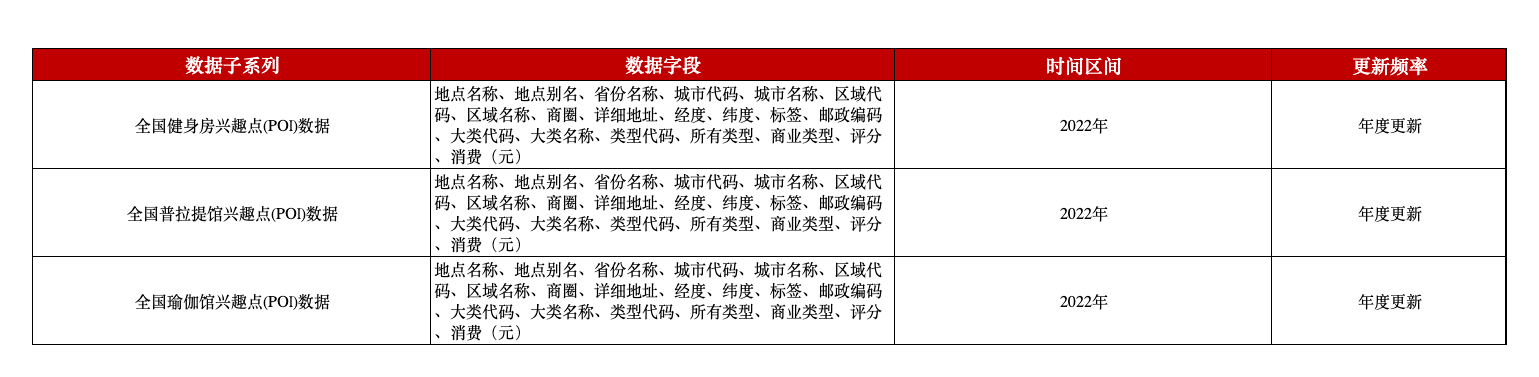 本平台推出的健身房POI数据覆盖全国34个省份的11万个健身场所网点,包含涵盖了健身、瑜伽、普拉提等与健康和身体锻炼相关的类别。这些数据包括各个健身场所的名称、所属大类、具体的经纬度位置、所在省份、城市和区域等详细信息,为相关研究助力。