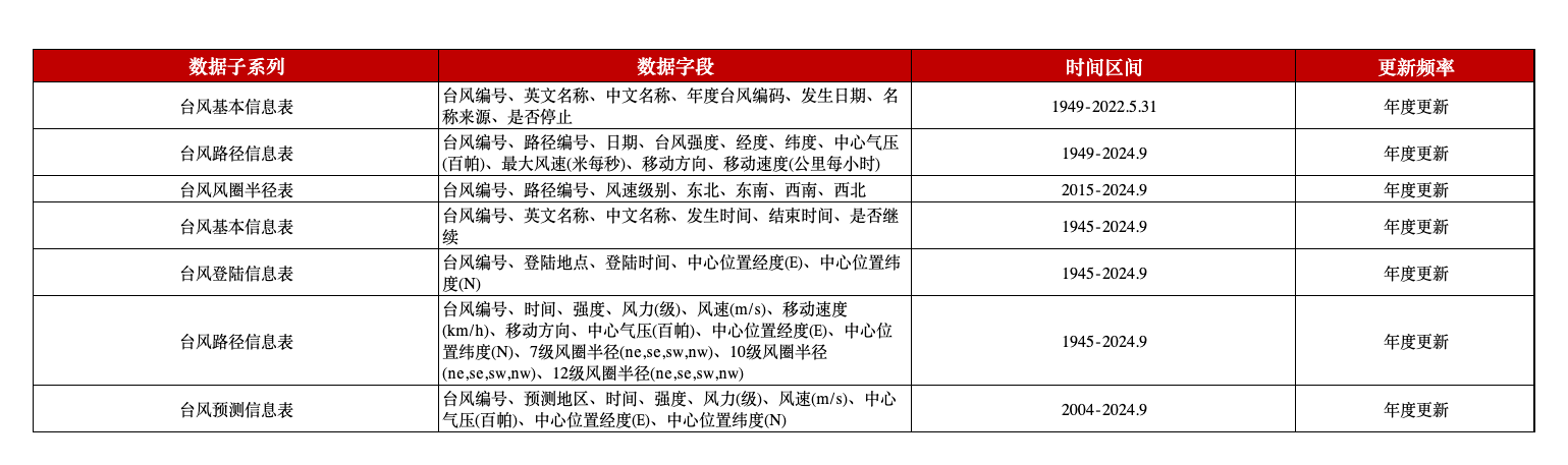 本平台数据团队推出的台风数据库,共包含来自两个来源的台风信息,各来源在字段、数据量方面均有不同,学者可根据自身研究需求自由选择。其中,A来源包含台风基本信息、台风路径信息、台风风圈半径三张子表;B来源包含台风基本信息表、台风登陆信息表、台风路径信息表、台风预测信息表四张子表,此二来源全面、完整地涵盖了我国东南沿海至西太平洋的台风相关信息,为相关研究提供了优质的数据资源。