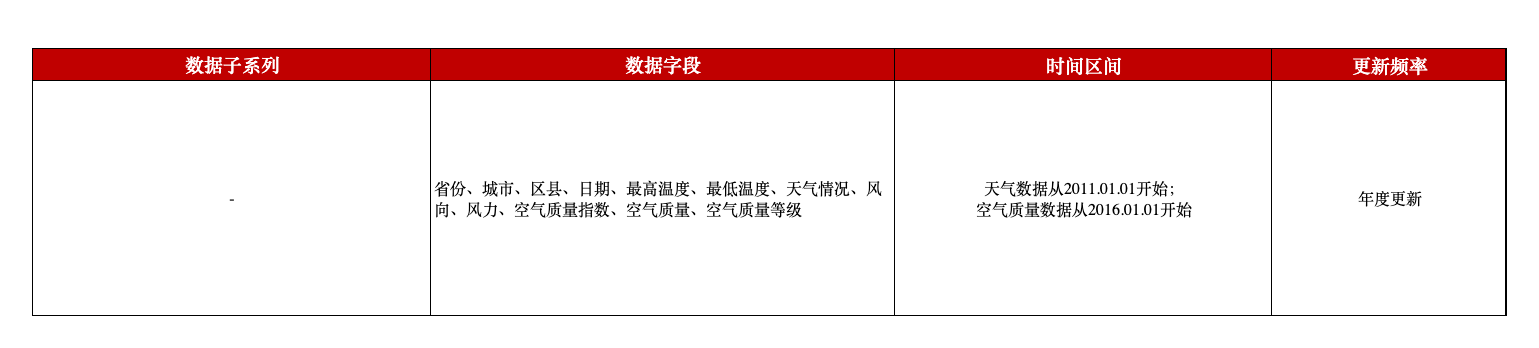 我国关于经济发展的研究对气象因素的分析还有所欠缺,以此为契机,本平台平台推出历史天气数据,囊括中国所有城市(含县)自2011年以来 的历史天气数据,指标包含温度、天气、风向风力、空气质量等内容。