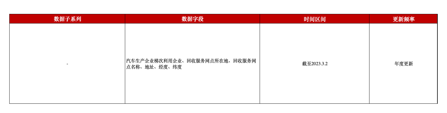 本平台推出新能源汽车动力蓄电池回收服务网点数据,包含全国范围内的新能源汽车动力蓄电池回收服务网点的企业名称、网点名称及所在地信息,并额外提供了所在地的经纬度,以更好地支撑相关学术研究。