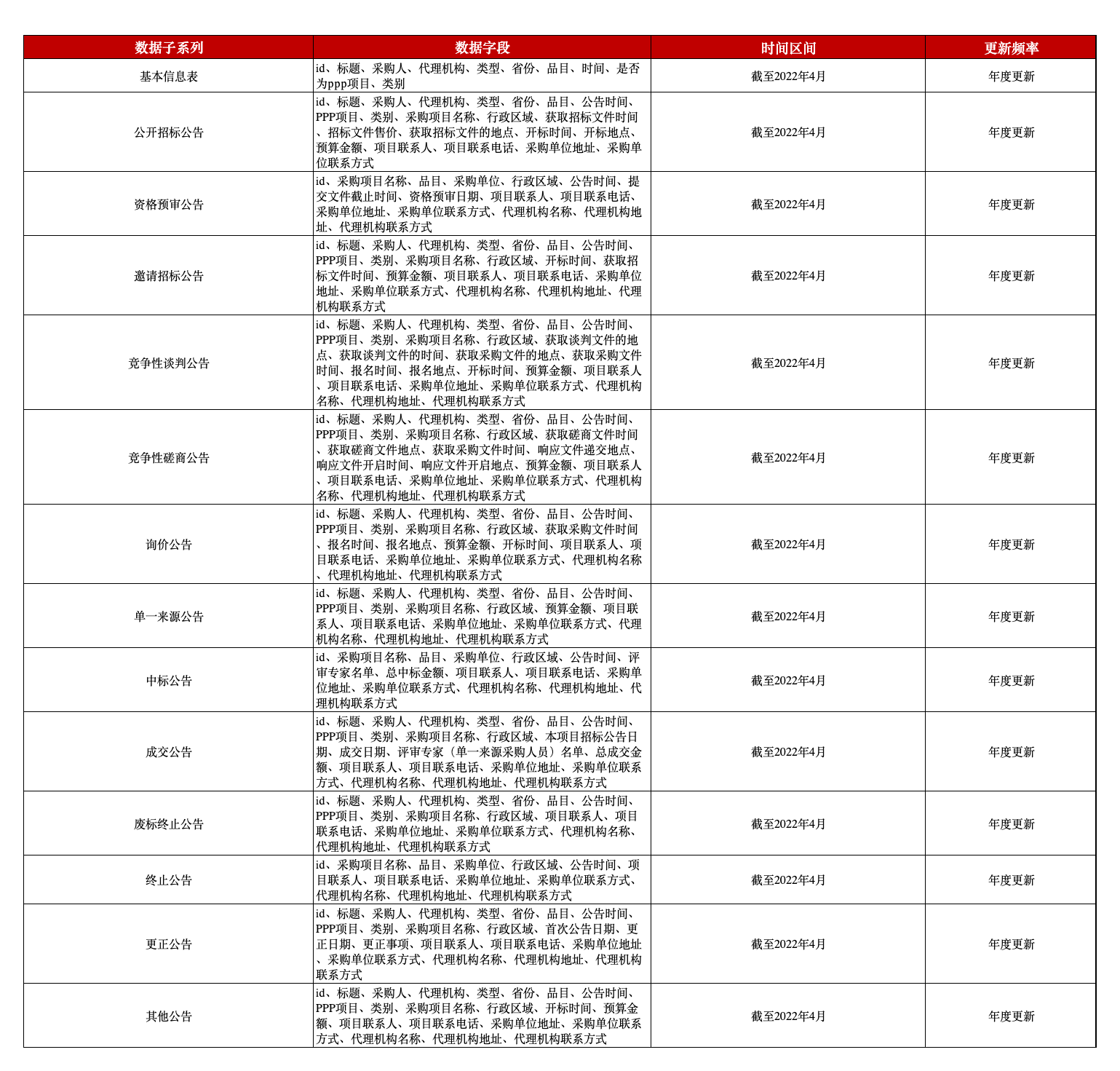 目前,本平台数据团队已经推出政府采购数据,此数据主要是展示中标结果。但是在政府采购流程上,现有的政府采购数据无法体现政府采购流程。为此,本平台数据团队推出政府采购公告数据,详细展示了政府采购流程中政府采购项目公告流程信息。该数据包含基本信息表、资格预审公告、中标公告、成交公告、废标终止公告、终止公告、更正公告。以及公开招标公告、邀请招标公告等招标方式公告,含有标题、采购人、采购项目名称、类别等字段,以期为相关研究提供优质的数据资源。