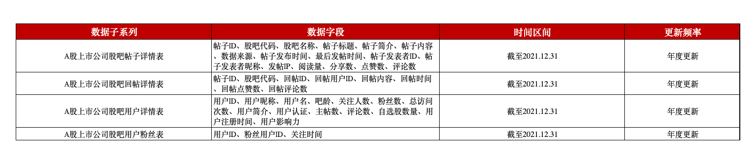 本平台发布的A股上市公司股吧文本数据以文本信息内容为主,充分展现投资情绪,同时也直观展现各帖内容情况、发帖人账号注册省市、关注与被关注等多方面内容,尤其各表之间以帖子ID和用户ID为主体字段,增强了表格之间的关联度,提升使用感。