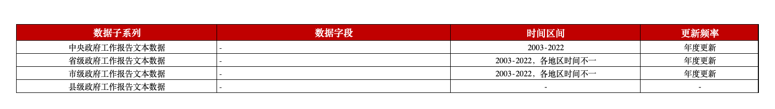 中国各地区政府工作报告数据覆盖全国国务院、省级政府、市级政府在内的三级政府部门的工作报告文本文件,时间跨度近20年,充分展现了我国二十一世纪以来国家行政管理部门的工作成效,是极有价值的文本分析数据,为公共治理、行政管理等方面的学术研究提供助力。