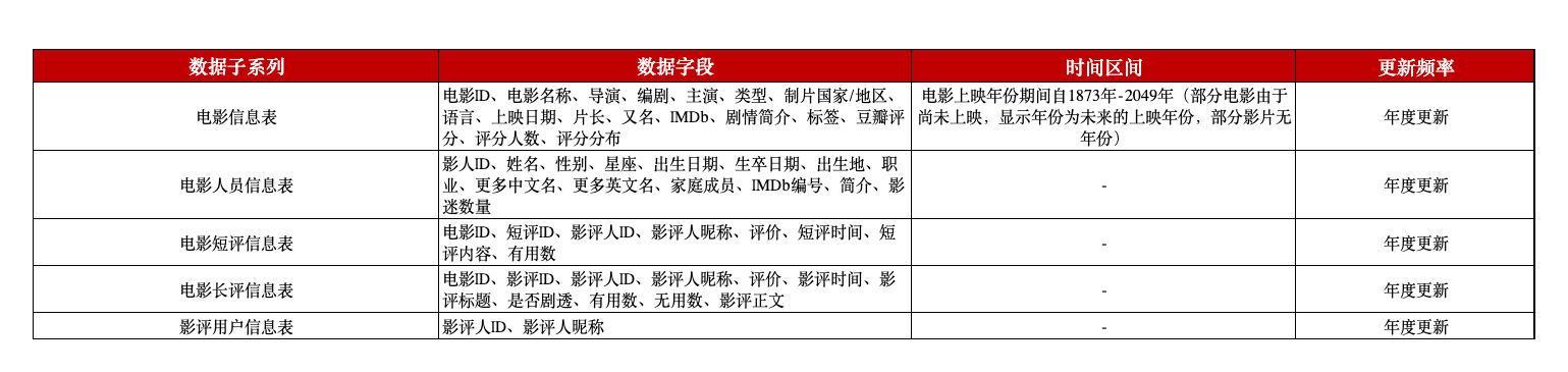 本平台推出的电影评论数据包含5个部分:电影信息表、电影人员信息表、电影短评信息表、电影长评信息表、影评用户信息表,全面涵盖了电影相关的所有评论信息,尤其是包括了大量简洁的短篇以及优质的长篇电影评论,为相关研究提供了丰富的文本数据。