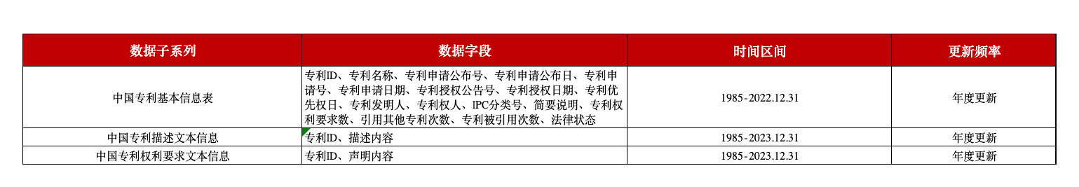 中国专利文本数据共涵盖两个部分内容,分别是:专利描述文本信息与专利权利要求文本信息。