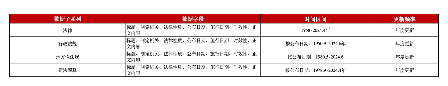 本平台推出的中国法律法规数据库,涵盖中华人民共和国的法律、行政法规、地方性法规以及司法解释四个模块,包含标题、制定机关、法律性质、施行日期、正文内容等字段。本数据包含有效、已修改和已废止三种法律时效性情况。