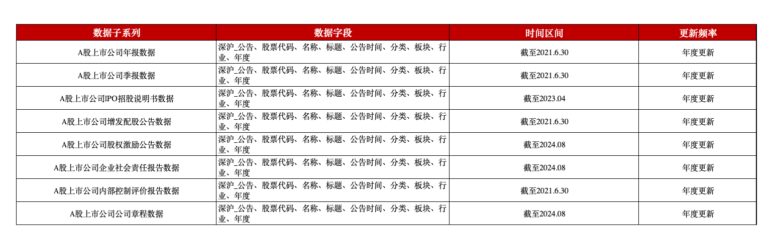 A股上市公司年报数据、A股上市公司季报数据、A股上市公司IPO招股说明书数据、A股上市公司增发配股公告数据、A股上市公司股权激励公告数据、A股上市公司企业社会责任报告数据、A股上市公司内部控制评价报告数据、A股上市公司公司章程数据。