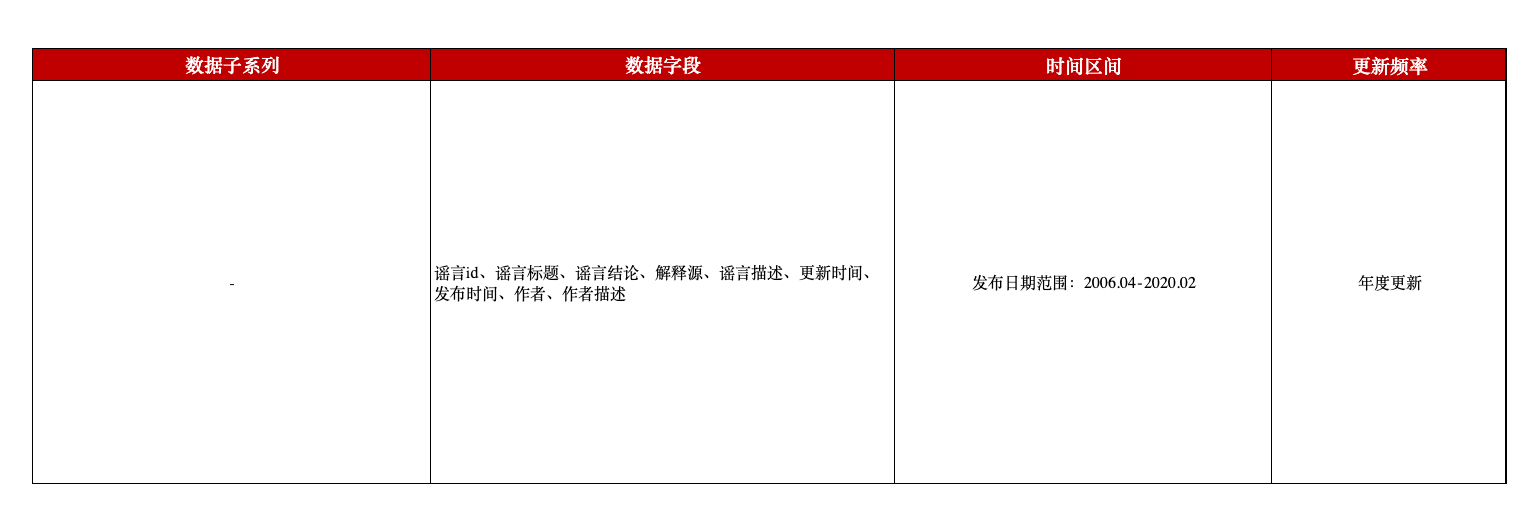 本平台数据团队推出的谣言数据,收集整理了较真查证平台上的辟谣信息,包含谣言内容和时间、辟谣结论和时间,以及辟谣人员及其单位,为谣言相关研究提供了数据资源。