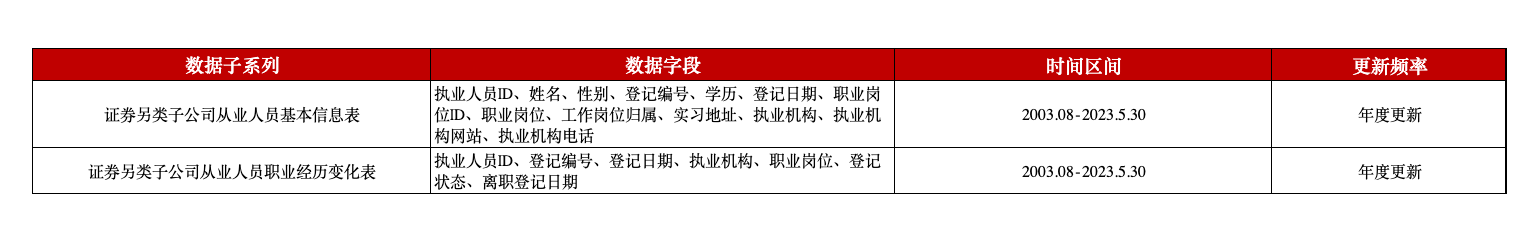 本平台证券另类子公司从业人员信息数据包含自2003年以来的证券公司执业人员的基本信息和职业经历变化信息,包含姓名、学历、登记编号、岗位、执业机构、登记日期、离职登记日期等字段。