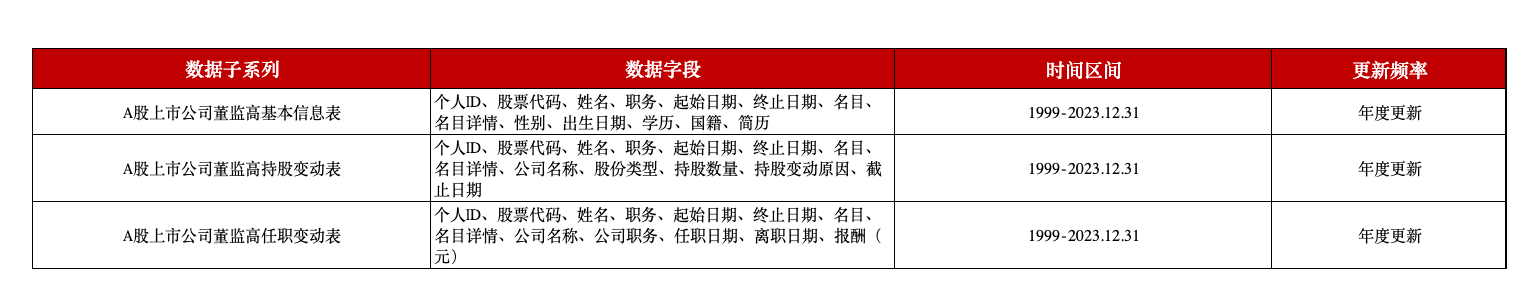 本平台推出A股上市公司董监高信息数据,包含了上市公司历届高管、董事会和监事会人员数据,分为上市公司董监高基本信息表、上市公司董监高持股变动表、上市公司董监高任职变动表。