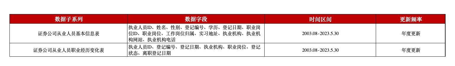本平台证券公司从业人员信息数据包含自2003年以来的证券公司执业人员的基本信息和职业经历变化信息,包含姓名、学历、登记编号、岗位、执业机构、登记日期、离职登记日期等字段。