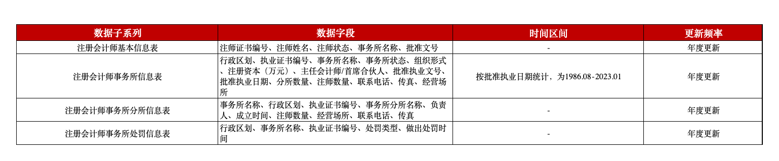本平台整理注册会计师及事务所信息,覆盖注册会计师、事务所分所、事务所处罚等多个信息,囊括:事务所名称、批准执业文号、执业证书编号、行政区划、成立时间、处罚类型、注师数量等字段内容,为相关研究提供数据助力。