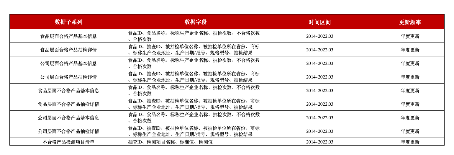 本平台推出的食品安全抽检数据,覆盖我国自2014年以来的食品抽检结果信息,包括合格产品及不合格产品两个方面,其中,基本信息表包含食品名称、标称生产企业名称、抽检次数、不/合格次数;抽检详情表包含被抽检单位名称、所在省份、商标、标称生产企业地址、生产日期/批号、规格型号、抽检结果、检测项目名称、标准值、检测值,该数据为食品安全研究提供权威且全面的优质数据。