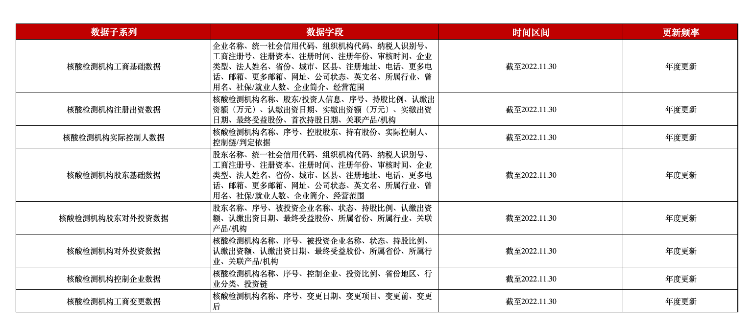 基于上述背景,本平台依据全国核酸检测机构名单,获取了所有核酸检测机构的工商基础信息、股东信息、股东对外投资信息、工商变更信息等,为相关研究助力。