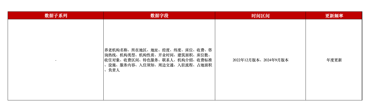 为支持相关研究,本平台推出全国养老机构数据,覆盖全国近三万个养老服务机构的相关信息,包含机构名称、所在地区、经纬度、机构类型、床位数、收费标准等字段。