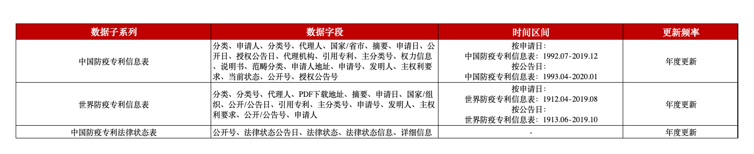 本平台平台将涉及到新冠病毒防疫的相关专利信息数据加以汇总,为下一步疫情防控科研和治疗工作提供基础和支撑,具体内容涵盖新冠肺炎治疗用药、预防用药、检测和诊断试剂盒、医疗器械、防护产品、医用消毒、医疗废弃物处理、废水处理 等多个领域,以期有效分析研判冠状病毒、科学防控疫情传播、研发治疗和预防药物。