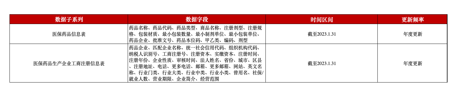 为助力相关研究,本平台推出中国医保药品数据,覆盖全国纳入医保药品体系的药品信息及药品企业的工商注册信息,包含药品名称、药品类型、药品代码、批准文号、企业社会统一信用代码、企业注册地址、企业所属行业等字段。