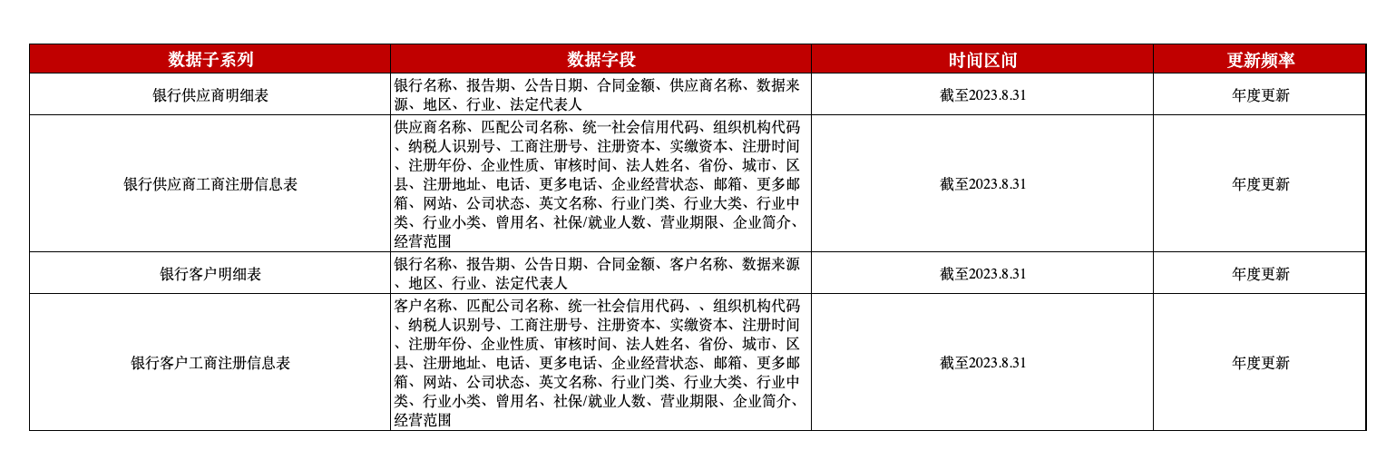 为助力相关研究,本平台推出中国全部银行供应商客户数据,覆盖国内一千多家银行的上下游单位及客户、供应商的工商注册基本信息,包含银行名称、合同金额、公告日期、供应商名称、客户名称、数据来源等字段。