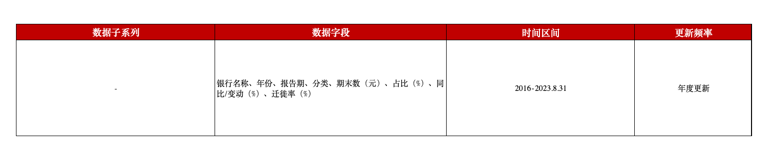为助力相关研究,本平台推出中国全部银行贷款五级分类数据,覆盖国内近一千家银行的年报及中报披露的贷款五级分类信息,包含银行名称、年份、报告期、分类、期末数、占比等字段。