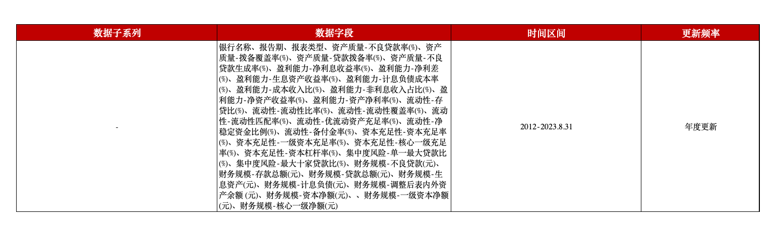 为助力相关研究,本平台推出中国全部银行专项指标数据,覆盖国内一千五百多家银行的年报、季报及中报中的各类专项指标信息,包含银行名称、报告期、不良贷款率、净利息收益率、存贷比、资本充足率等字段。