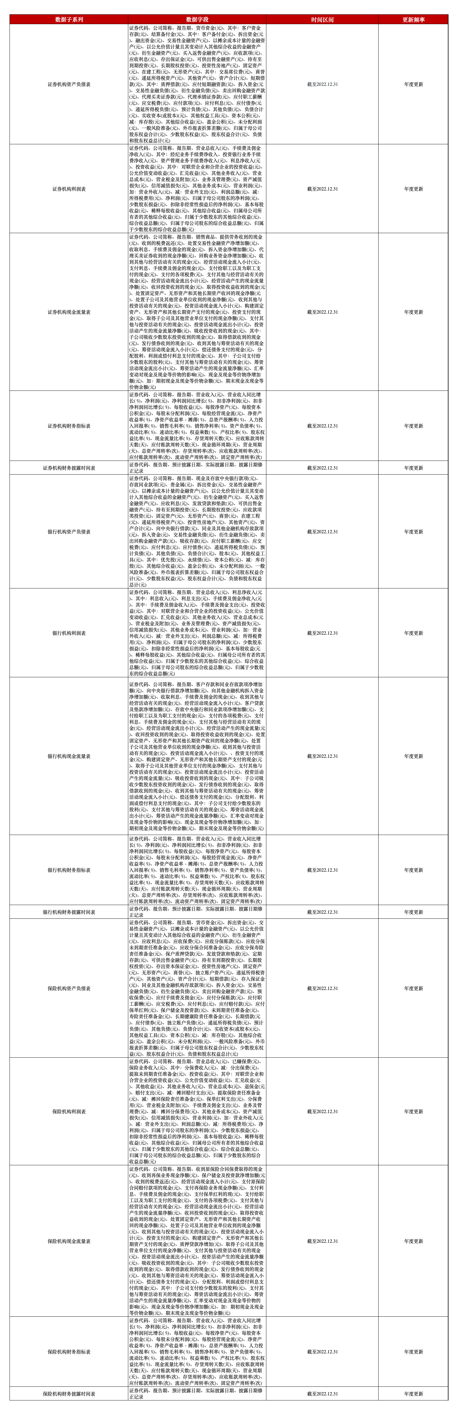 为助力相关研究,本平台推出A股上市金融机构财务报表数据,覆盖年报、季报、半年报,包含了上市金融机构资产负债表、上市公司金融机构表、上市金融机构现金流量表、上市金融机构财务指标表、上市金融机构财报披露时间表等5张表。