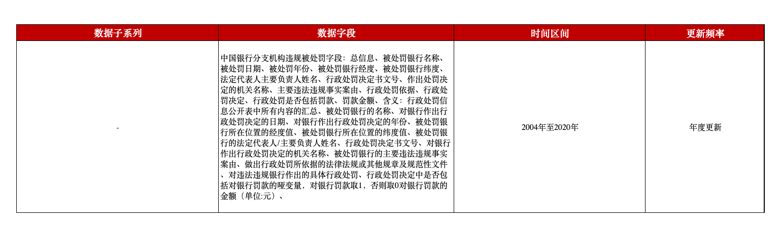 本数据除涵盖中国银保监会官网公布的行政处罚决定书文中全部内容外,即包含被处罚单位及法人、案由、依据、处罚决定、做出处罚的机关名称、处罚时间等,还整合了被处罚银行的经纬度,便于定位和进行空间计量分析。 本数据仅包含中国银保监会针对银行的行政处罚信息,不包括银保监会针对个人作出的行政处罚。