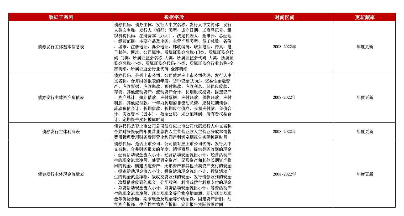 债券市场的研究对于构建债券市场新格局具有重要意义。因此,本平台推出了中国债券发行主体信息数据,分为债券发行主体基本信息表、债券发行主体资产负债表、债券发行主体利润表、债券发行主体现金流量表,可以为研究资本市场问题提供数据基础。