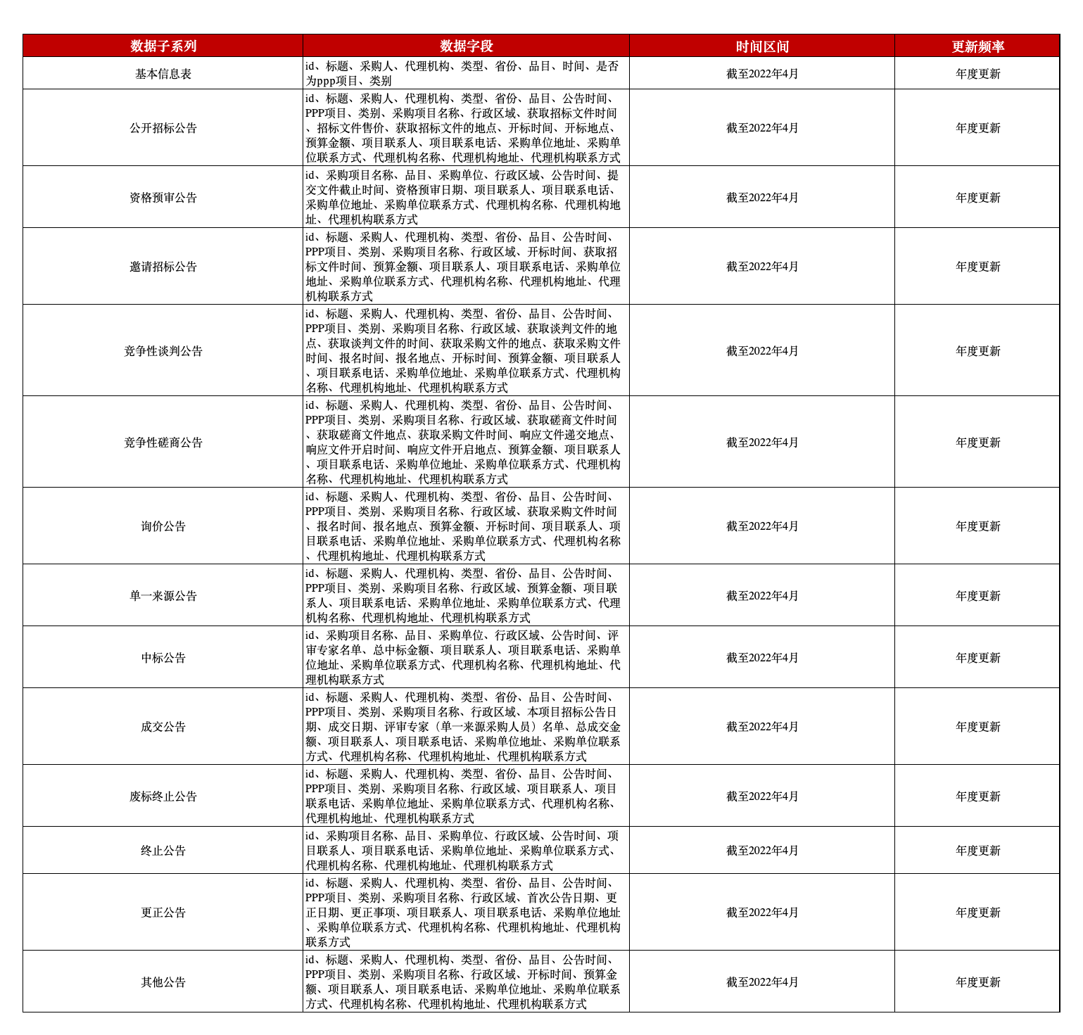目前,本平台数据团队已经推出政府采购数据,此数据主要是展示中标结果。但是在政府采购流程上,现有的政府采购数据无法体现政府采购流程。为此,本平台数据团队推出政府采购公告数据,详细展示了政府采购流程中政府采购项目公告流程信息。该数据包含基本信息表、资格预审公告、中标公告、成交公告、废标终止公告、终止公告、更正公告。以及公开招标公告、邀请招标公告等招标方式公告,含有标题、采购人、采购项目名称、类别等字段,以期为相关研究提供优质的数据资源。