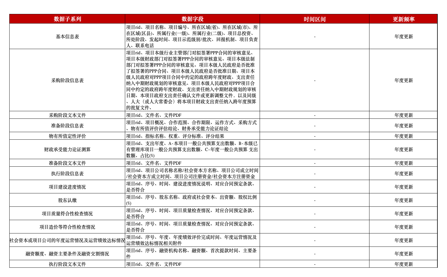 PPP项目数据是本平台开发的政企合作型城市基础设施项目数据,覆盖项目基本信息、准备阶段、采购阶段、执行阶段全数据,各阶段均有部分表格为材料文件内容,以文件名作为主要显示方式。