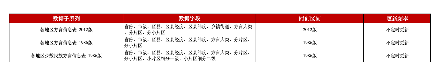 本平台根据《中国语言地图集》1986版与2012版,归结整理了两个版本的各地区方言信息表及一个各地区少数民族方言信息表,除了省市县、方言细分级别,还增加识别了区县经纬度。为相关研究提供全面的数据资源