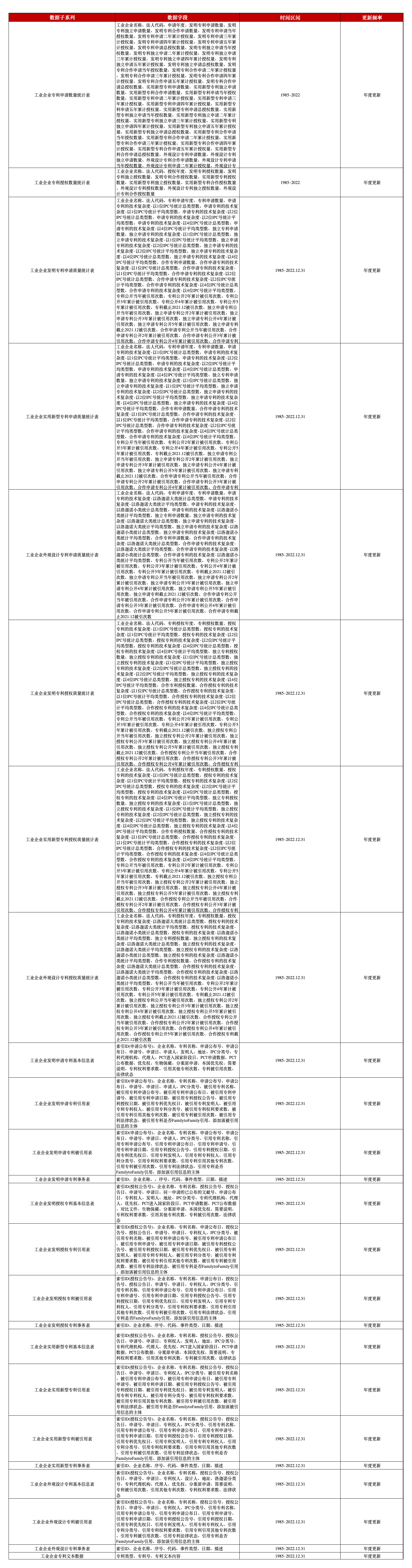 在结构上,本数据分为专利数量申请表、专利质量申请表、专利详情表。专利数量统计表和质量统计表,分别以专利申请和专利授权为依据再进行划分,专利质量统计表还按专利类型细分为发明、实用新型、外观设计三个模块。专利引用及被引信息体现于专利详情表部分,分为发明申请、发明授权、实用新型、外观设计四个模块,各模块包含基础信息表、引用表、被引用表、事务表四张表格(需要注意的是,外观设计无引用表)。