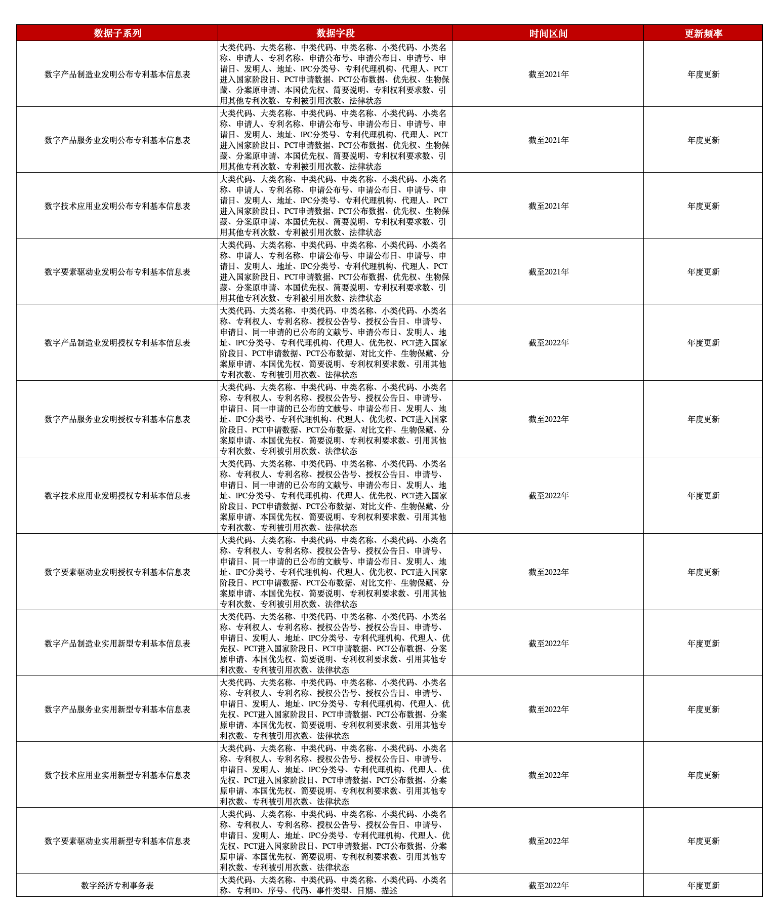在此标准出台之前,本平台依据《数字经济及其核心产业统计分类(2021)》与专利分类号对应国民经济行业分类标准为建库指导文件。此标准出台后,本平台将对以往的数据进行深层次的优化整理,并将推出数字经济系列专利分地区统计、分行业统计等相关数据,以期为学术界提供更优质、先进的数字经济专题数据支持。