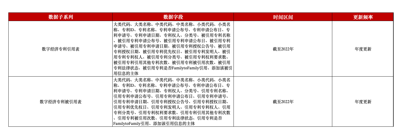 本平台数字经济专利引用及被引用数据在数据结构上分为2张表,即引用信息表、被引用信息表,主要是对:数字产品制造业、数字产品服务业、数字技术应用业、数字要素驱动业四类专利的引用及被引用信息。