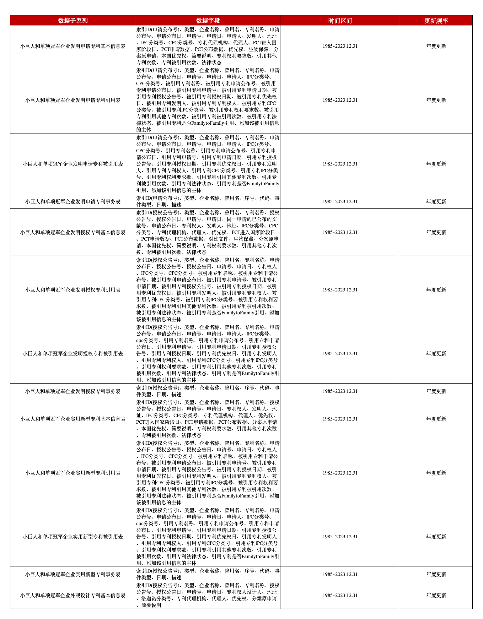 本平台专利系列数据已经覆盖到了上市公司、工业企业、高新技术企业、高校,本次新增小巨人和单项冠军企业专利数据,分为发明申请、发明授权、实用新型、外观设计四个模块,各模块包含基本信息表、引用表、被引用表、事务表四张表格(需要注意的是,外观设计只有基本信息表)。